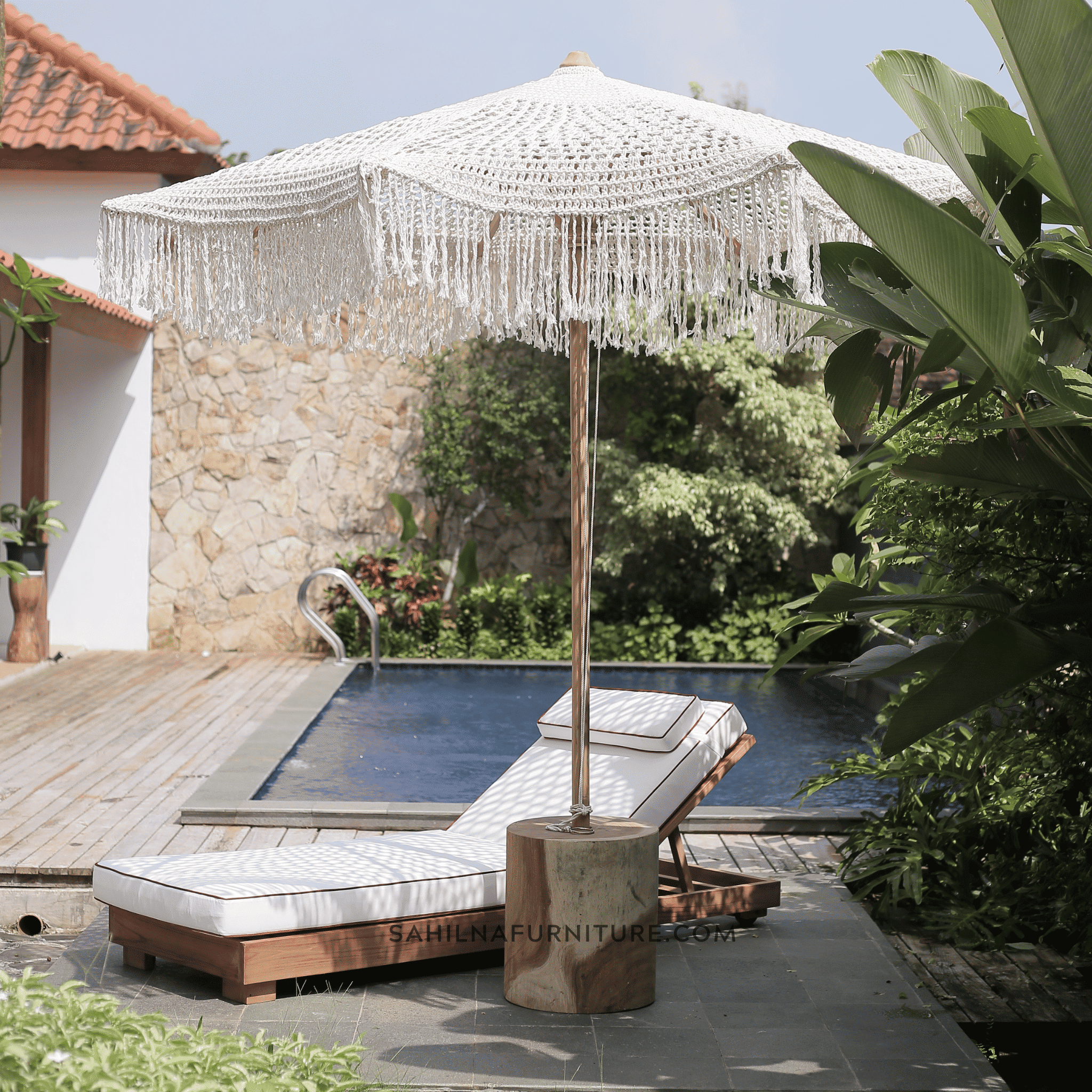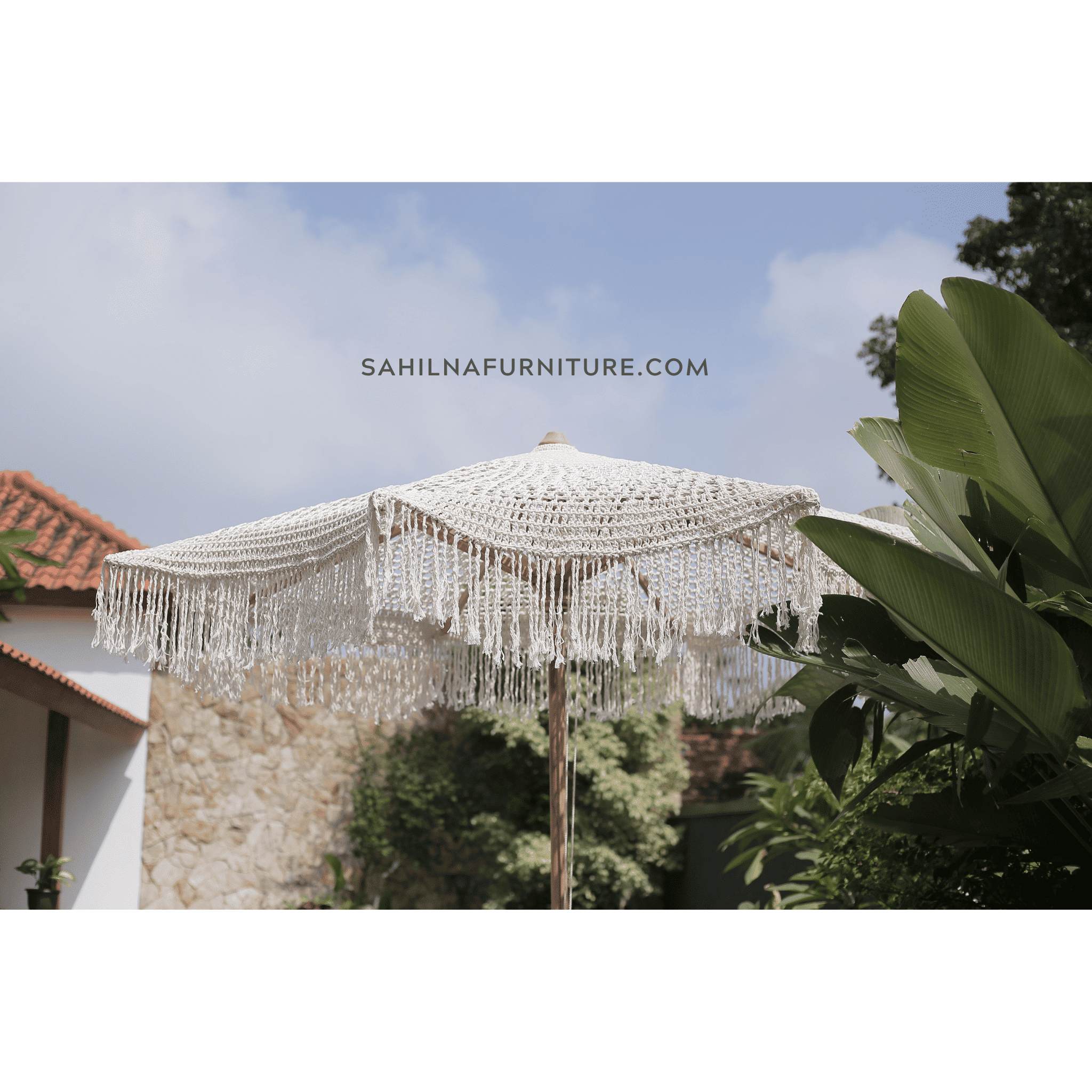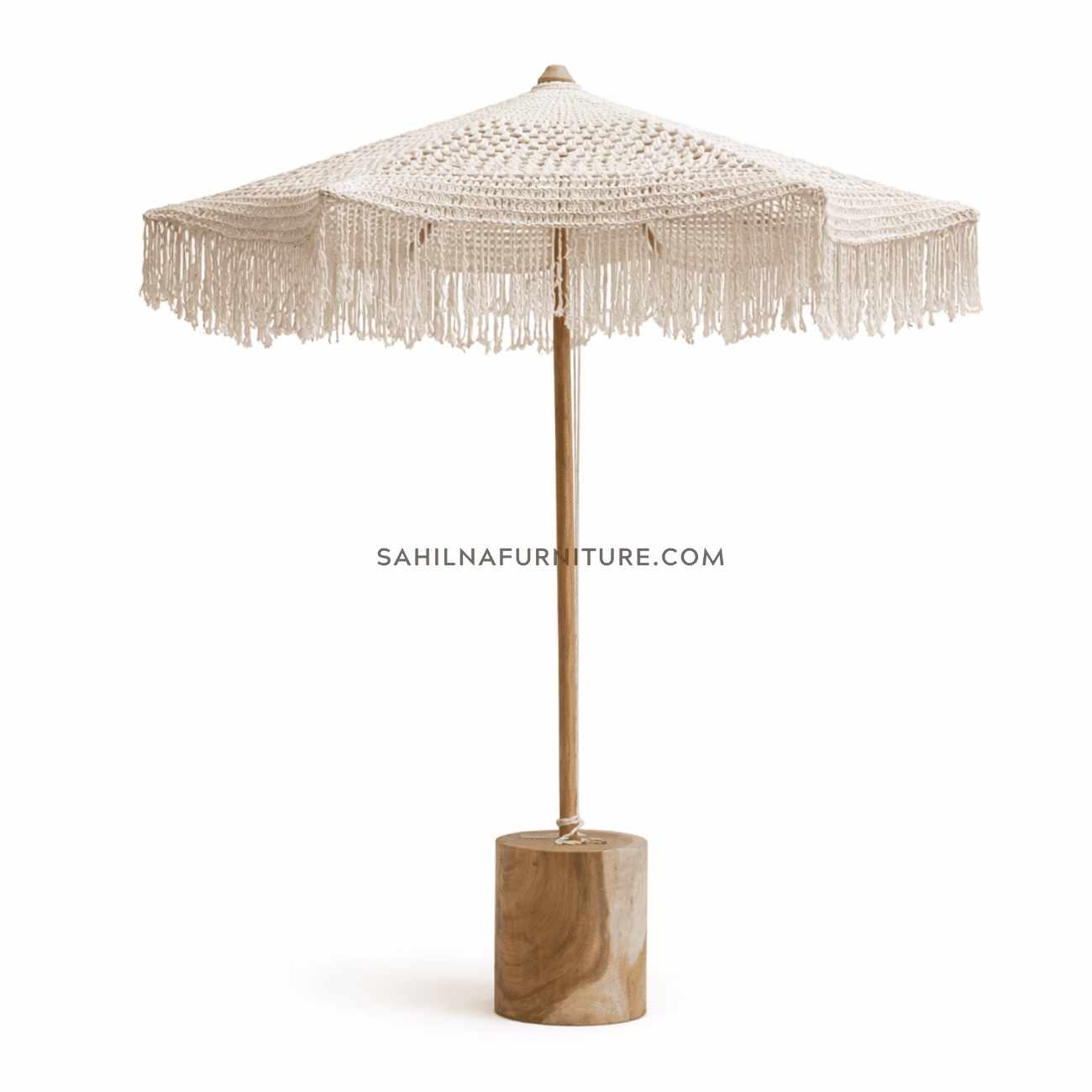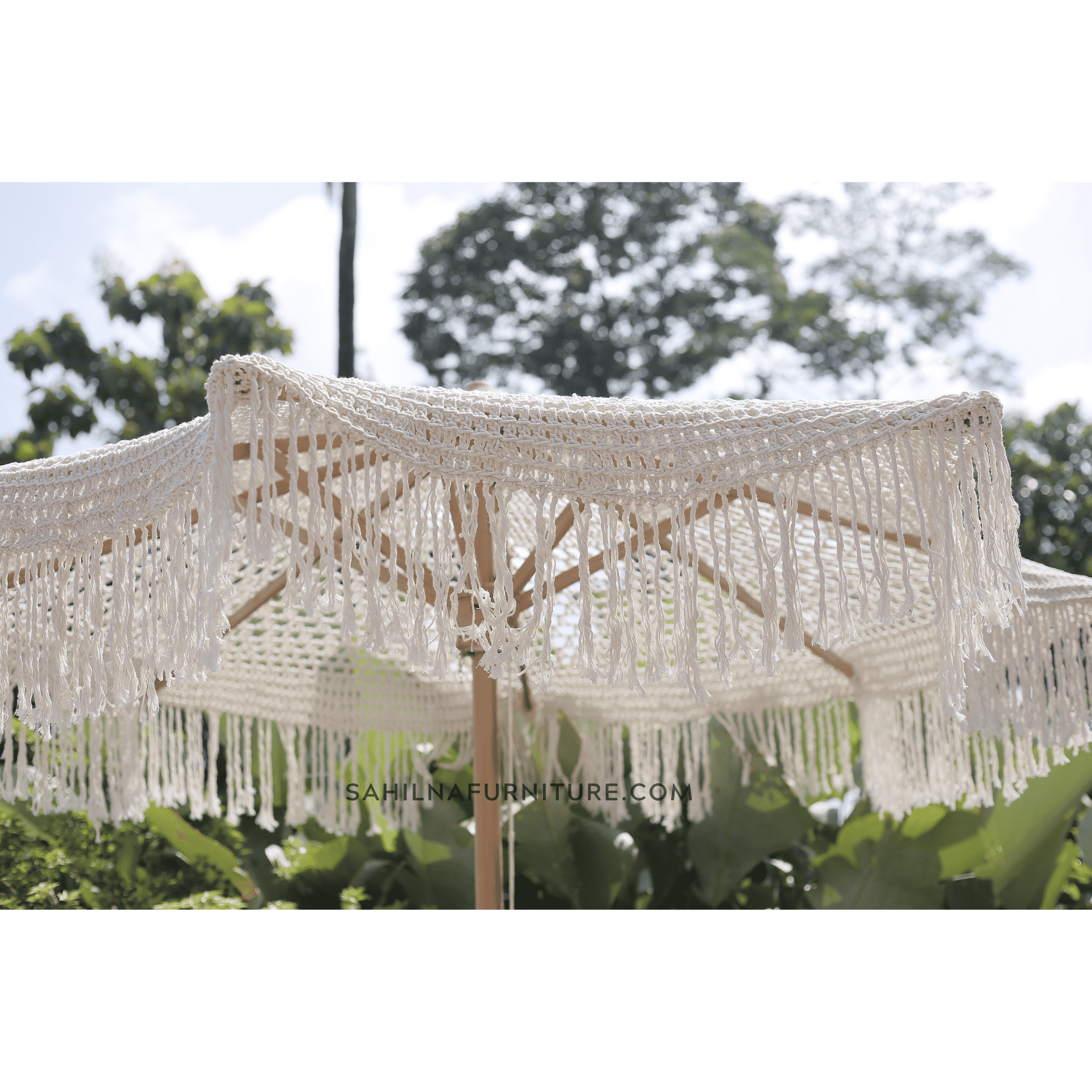Elevate your outdoor space with the Teak Outdoor Macrame Umbrella Vol 2. This statement piece combines a beautiful, light-filtering macrame canopy with the durable strength of a teak wood frame. It’s the perfect blend of artistry and resilience for your patio, garden, or poolside oasis.